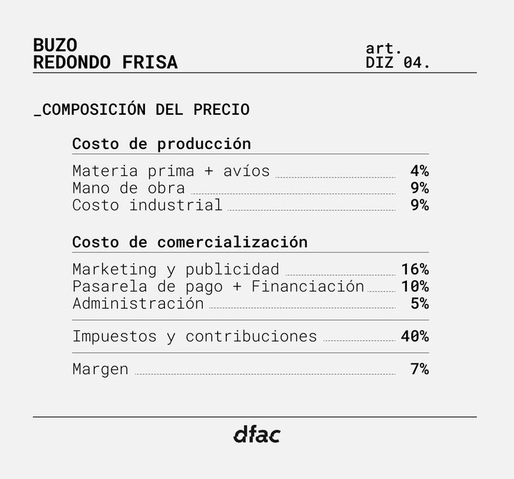 En cada prenda podes ver cuánto nos cuesta, cuánto invertimos, cuánto pagamos de impuestos, y cuánto nos cuesta.