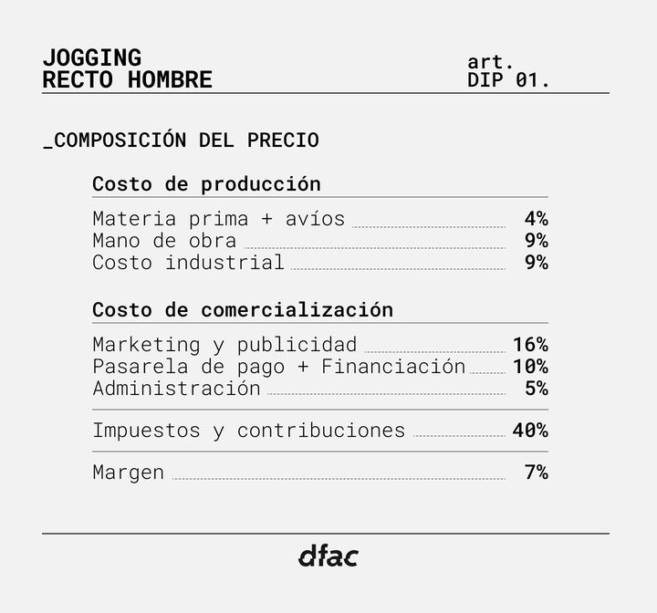 En cada prenda podes ver cuánto nos cuesta, cuánto invertimos, cuánto pagamos de impuestos, y cuánto nos cuesta.