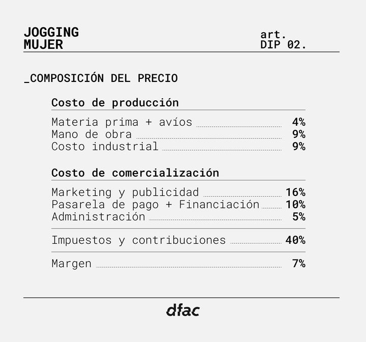 En cada prenda podes ver cuánto nos cuesta, cuánto invertimos, cuánto pagamos de impuestos, y cuánto nos cuesta.