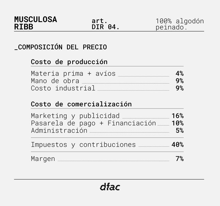 En cada prenda podes ver cuánto nos cuesta, cuánto invertimos, cuánto pagamos de impuestos, y cuánto nos cuesta.