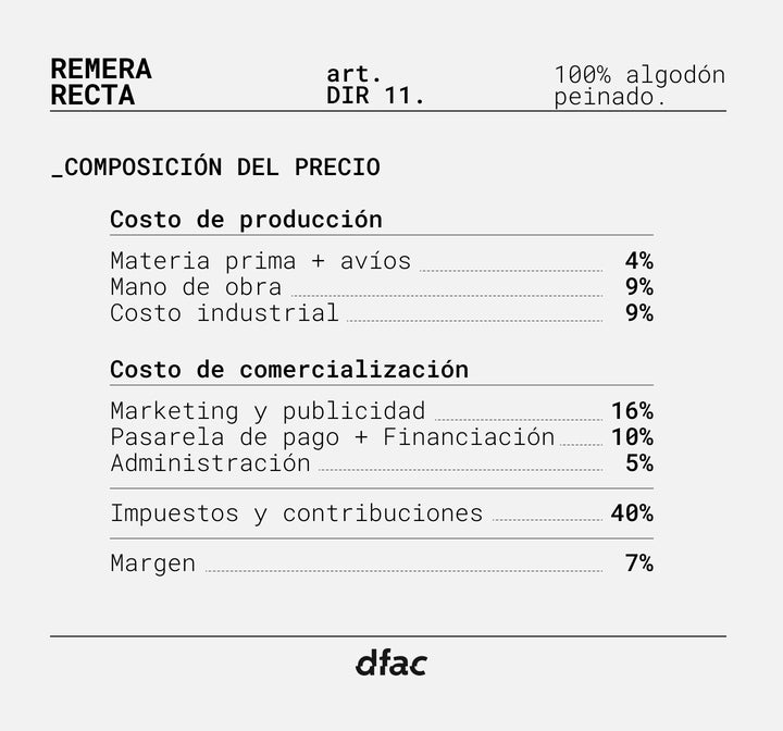 En cada prenda podes ver cuánto nos cuesta, cuánto invertimos, cuánto pagamos de impuestos, y cuánto nos cuesta.